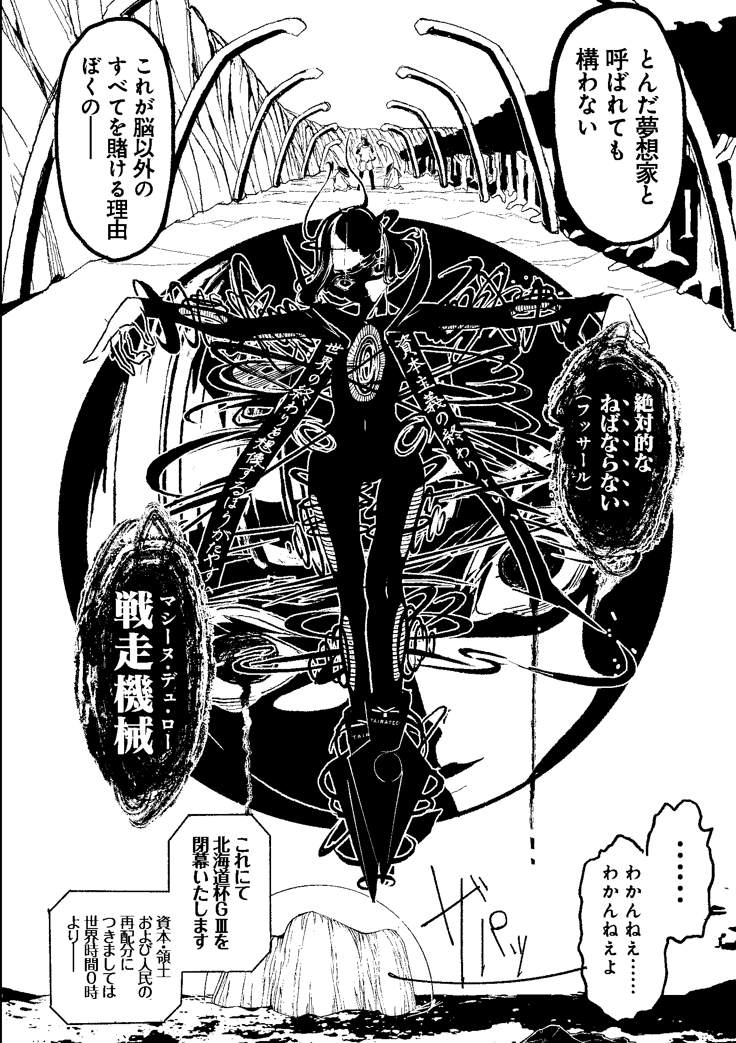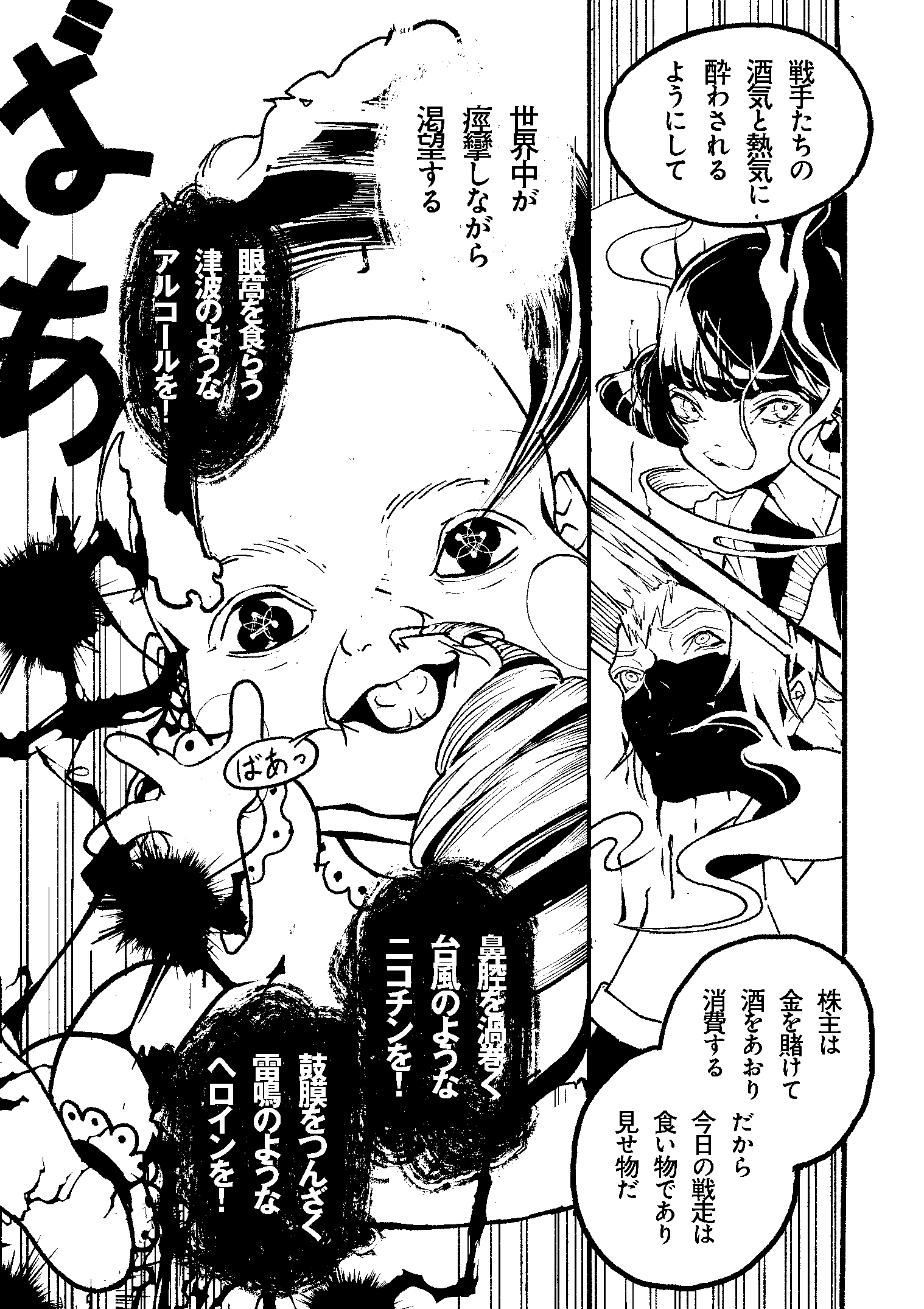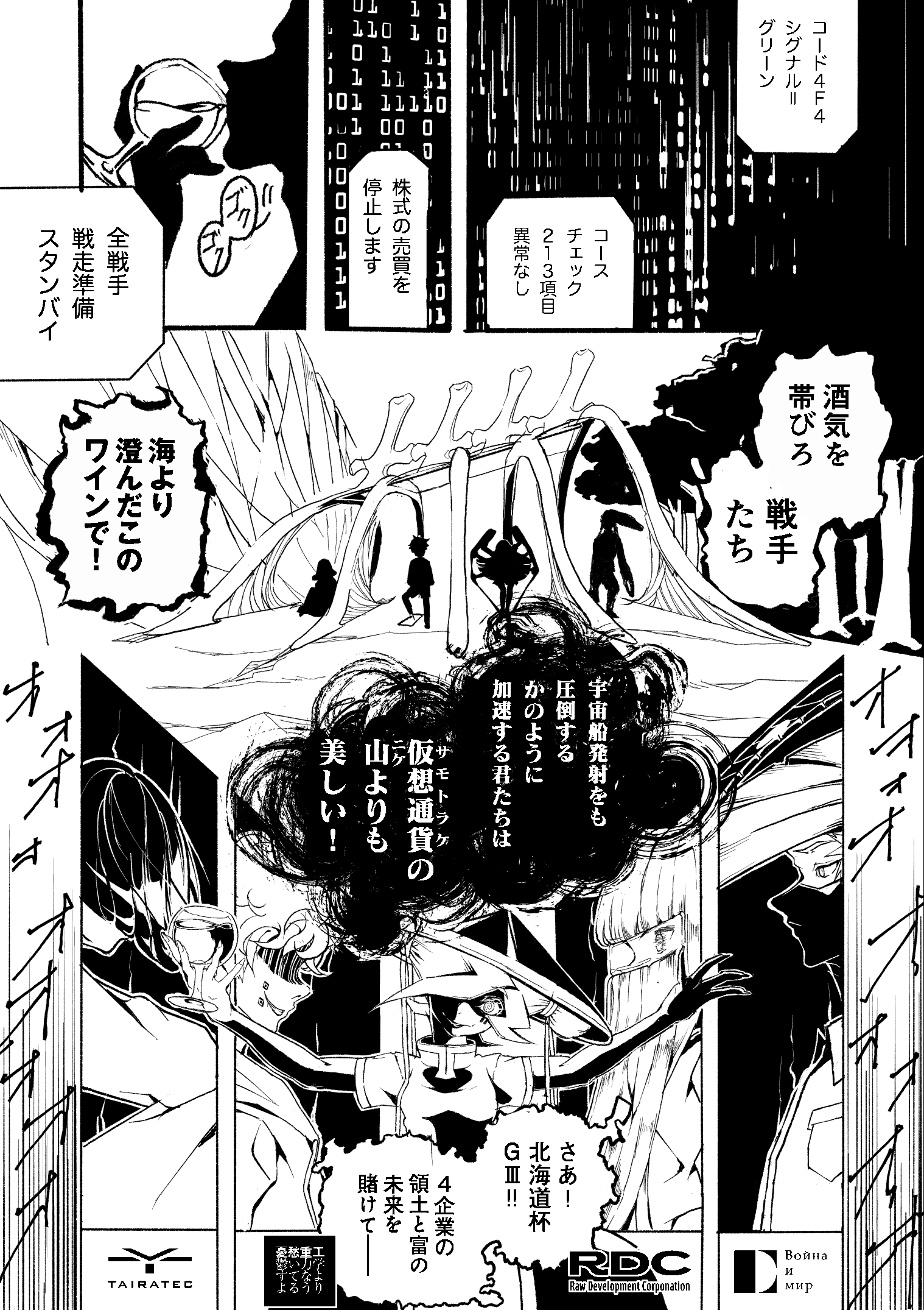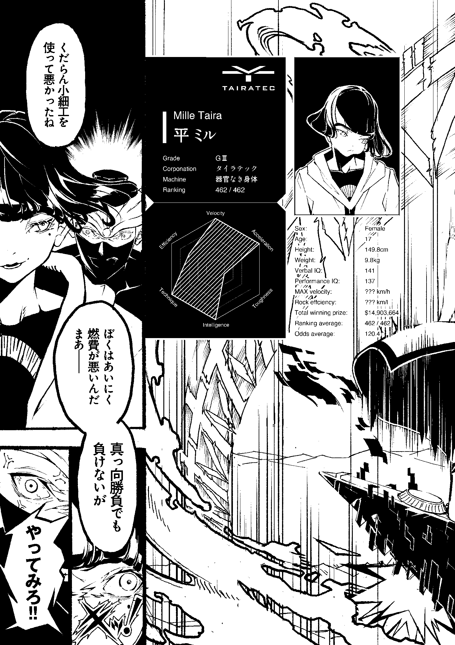 戦走、コーポライズされた戦手たちによるを駆使した超絶なレース。領土と富の獲得を目指し、北海道杯GⅢに臨む超個性的な4人の戦手たち。《イ・ミール社》のライカ・T・ニコラエヴィチ、《R.D.C》のヨルハ・スファイバー、《憂愁重工》のマー・ジン、そして、謎に包まれたベンチャー企業の平ミル。ブチ狂っているレースを生き残り、勝者となるのは誰か。加速、バイオ・パンク、改造された身体、ポスト・アポカリプス、変身、暴流の如き情報量と引用、驚嘆の展開。新鋭の著者が、圧倒的初速と衝動でぶっ放した処女作に乾杯を。(編・平大典)